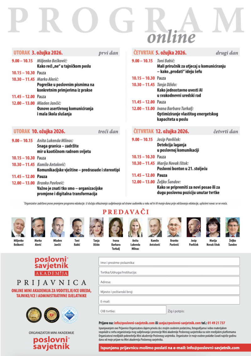 Online Mini Akademija Poslovnog savjetnika 2026., first minute popust! Program