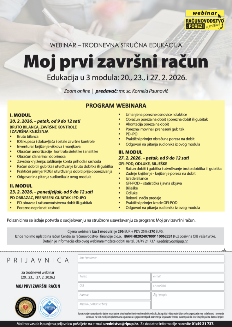 RiPup školica u tri modula: Moj prvi završni račun, RiPup online edukacija, online 20.2.2026. Program: MOJ PRVI ZAVRŠNI RAČUN - Edukacija u 3 modula | RAČUNOVODSTVO i POREZI u praksi (RiPup)