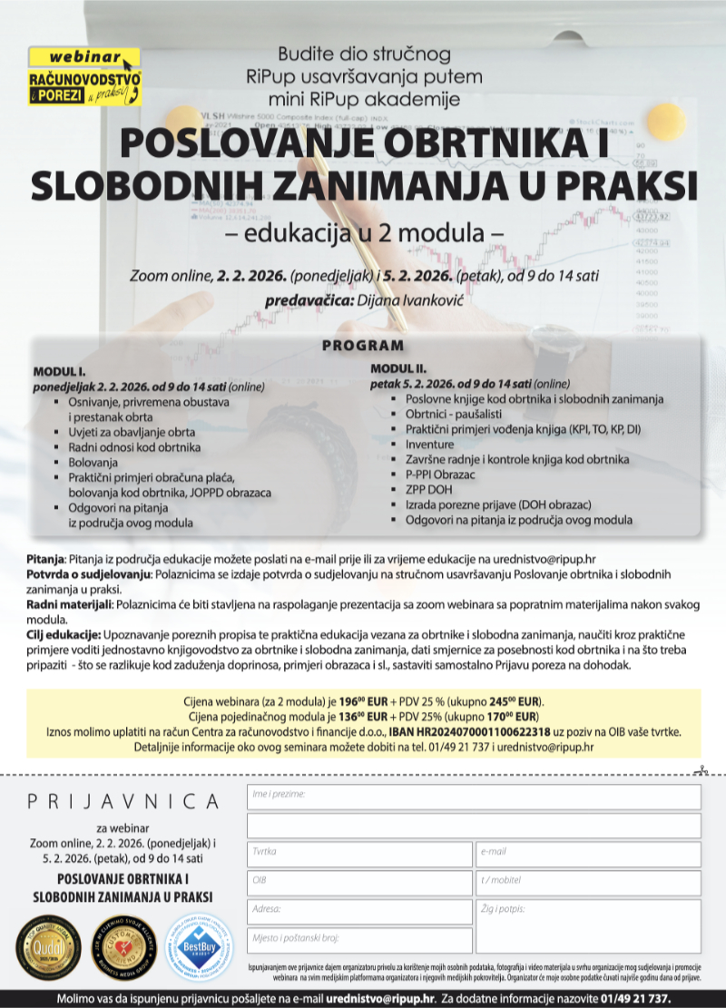 RiPup školica: Poslovanje obrtnika i slobodnih zanimanja, RiPup online edukacija u dva modula, 2.2. i 5.2.2026.