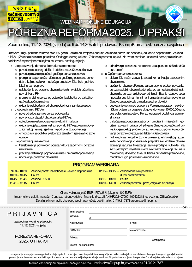 Porezna reforma 2025., online 11.12.2024.WEBINAR: POREZNA REFORMA 2025. U PRAKSI | RAČUNOVODSTVO i POREZI u praksi (RiPup)