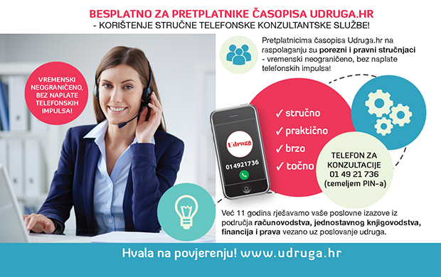 | TELEFONSKE STRUČNE KONZULTACIJE Pretplatnicima časopisa Udruga.hr omogućili smo korištenje besplatnih telefonskih konzultantskih usluga, te su vam na raspolaganju naši pravni i porezni eksperti kojima se putem telefona u posebno predviđeno vrijeme možete obratiti u vezi svojih dilema iz područja prava, financija, računovodstva, jednostavnog knjigovodstva i radnih odnosa, a vezano uz poslovanje udruga. |