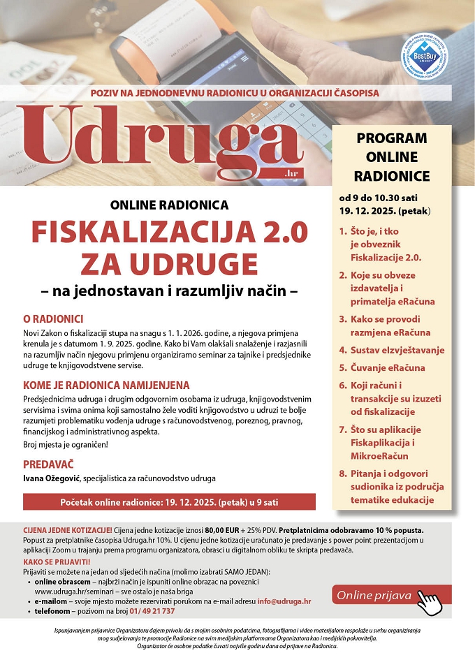 | Ovo je automatski generirana poruka (no-reply), za upite obratite se na urednistvo@udruga.hr ili tel. 01/49 21 737. Hvala na povjerenju. Webinar : FISKALIZACIJA 2.0 ZA UDRUGE – na jednostavan i razumljiv način, 19.12.2025. Program |