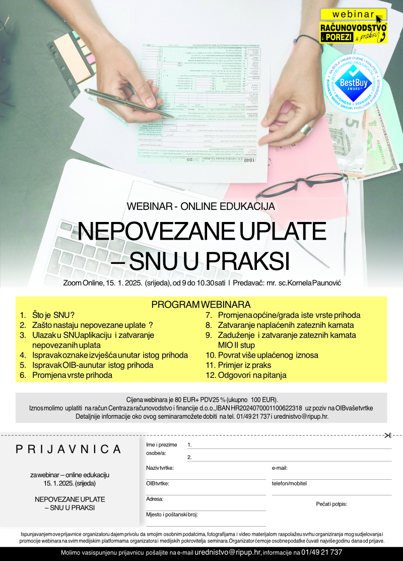 | Program: WEBINAR - ONLINE EDUKACIJA: Nepovezane uplate – SNU u praksi | RAČUNOVODSTVO i POREZI u praksi (RiPup) |