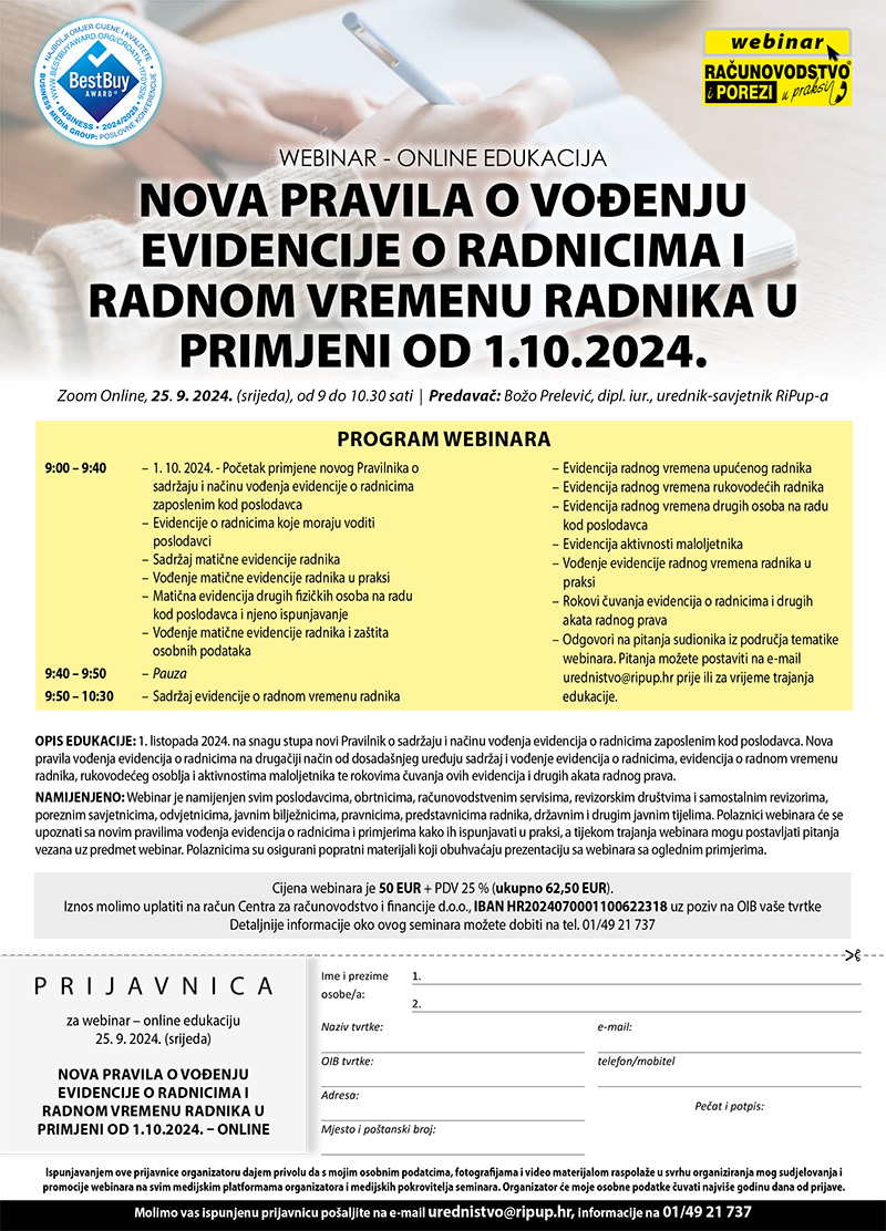 Program edukacije: WEBINAR - ONLINE EDUKACIJA: NOVA PRAVILA O VOĐENJU EVIDENCIJE O RADNICIMA I RADNOM VREMENU RADNIKA U PRIMJENI OD 1.10.2024. | RAČUNOVODSTVO i POREZI u praksi (RiPup) (racunovodstvo-porezi.hr)
