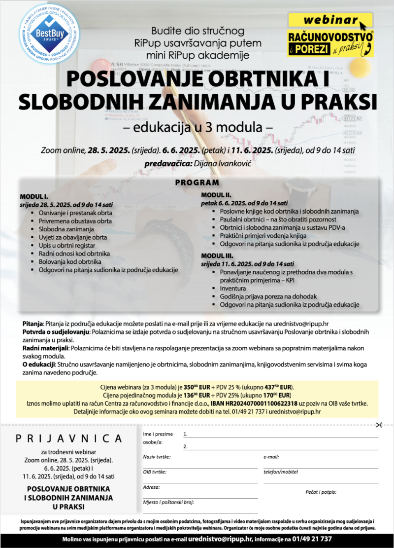 | RiPup online stručna školica, 3 modula, 28.5.2025. POSLOVANJE OBRTNIKA I SLOBODNIH ZANIMANJA U PRAKSI, Program: WEBINAR - ONLINE: POSLOVANJE OBRTNIKA I SLOBODNIH ZANIMANJA U PRAKSI – edukacija u 3 modula | RAČUNOVODSTVO i POREZI u praksi (RiPup) |