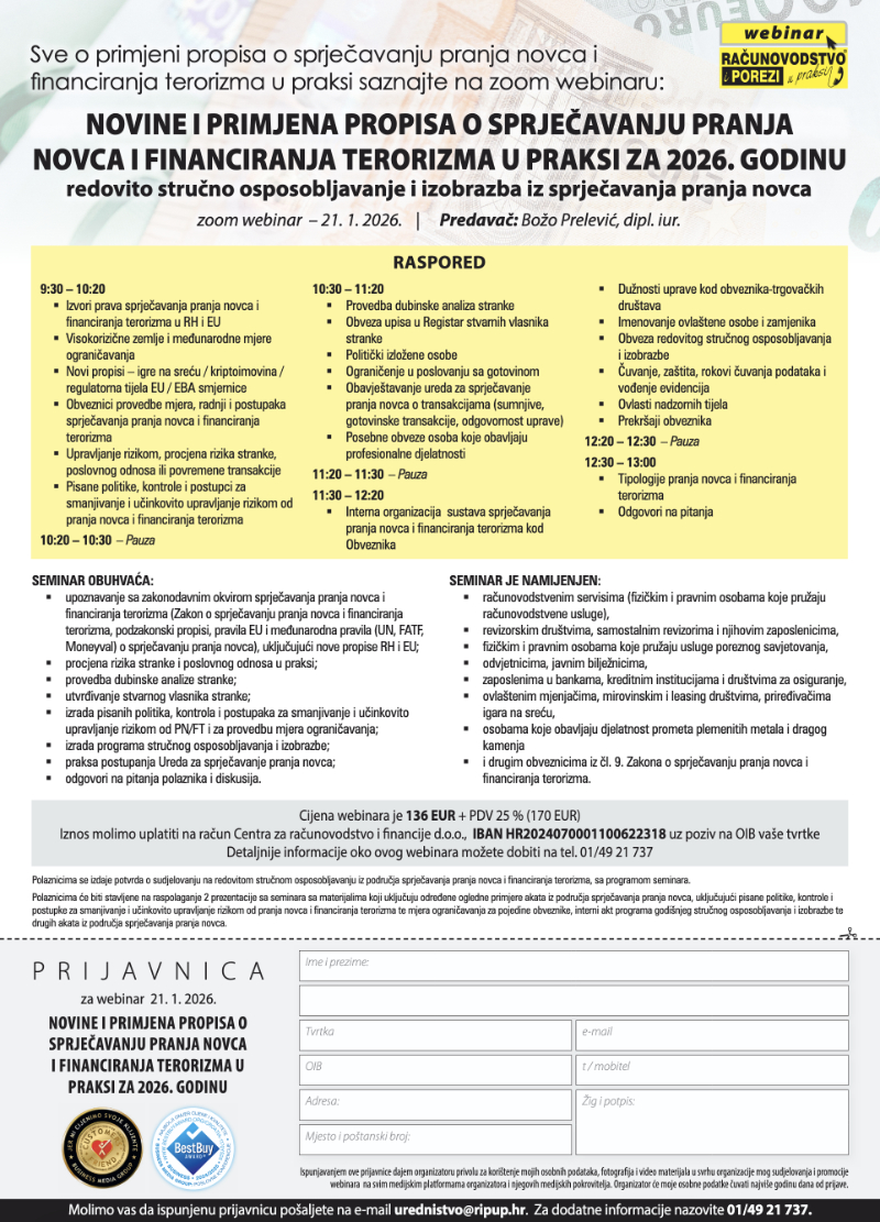 Online RiPup cerificirana edukacija, Primjena propisa o sprječavanju pranja novca i financiranja terorizma u praksi – Redovito stručno osposobljavanje i izobrazba iz sprječavanja pranja novca za 2026., srijeda, 21.1.2026., online Program