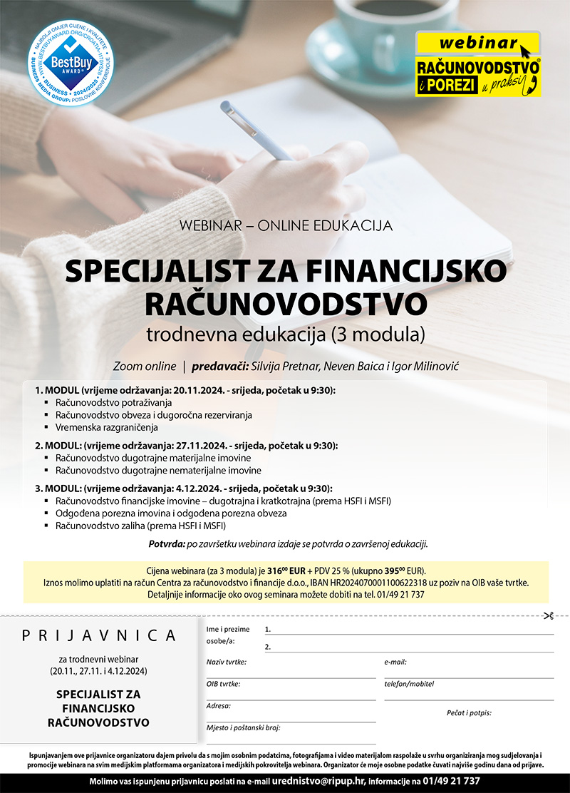 | Program edukacije: SPECIJALIST ZA FINANCIJSKO RAČUNOVODSTVO - trodnevna edukacija (3 modula) | RAČUNOVODSTVO i POREZI u praksi (RiPup) (racunovodstvo-porezi.hr) Ovo je automatski generirana poruka (no-reply), za upite obratite se na urednistvo@ripup.hr ili tel. 01 49 21 737. Hvala na povjerenju |