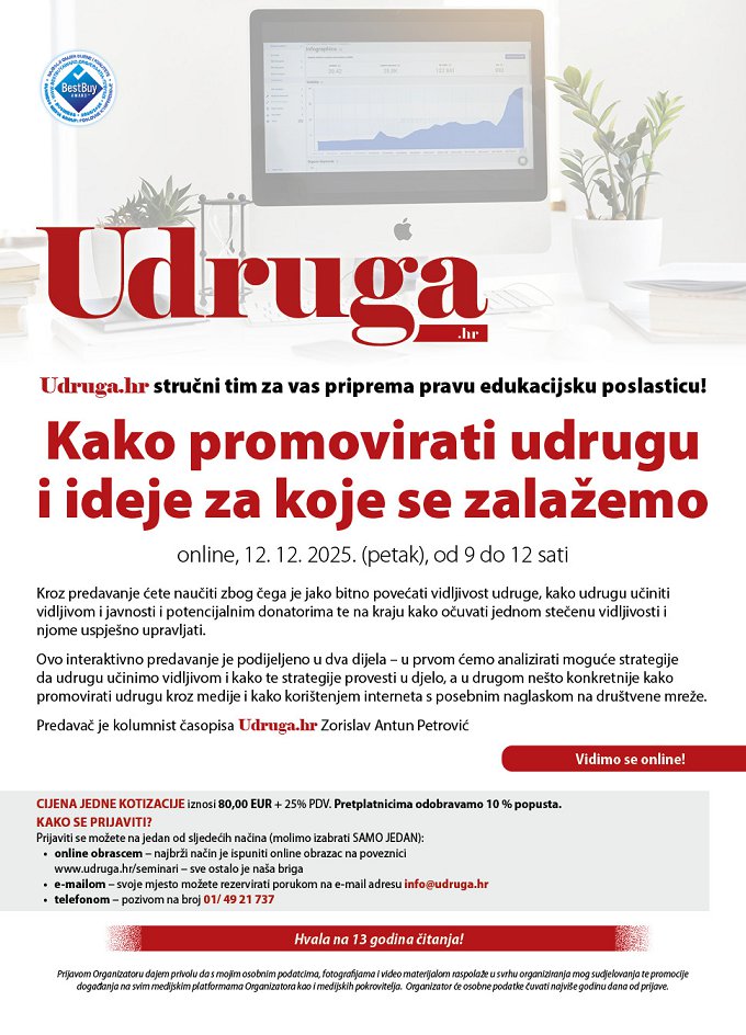 Webinar Webinar - Kako promovirati udrugu i ideje za koje se zalažemo, 12.12.2025. Program: https://udruga.hr/seminari/zoom-webinar-kako-promovirati-udrugu-i-ideje-za-koje-se-zalazemo/